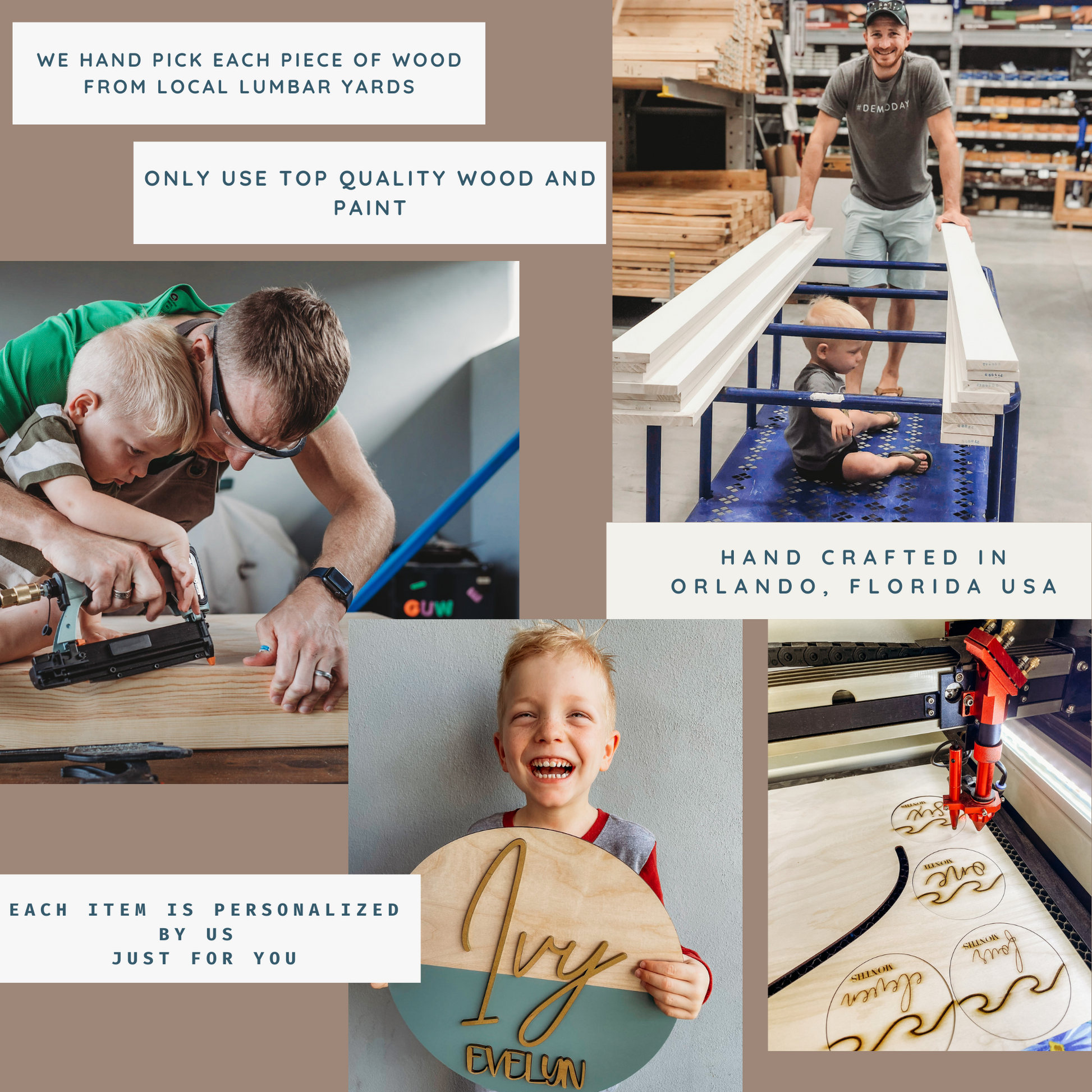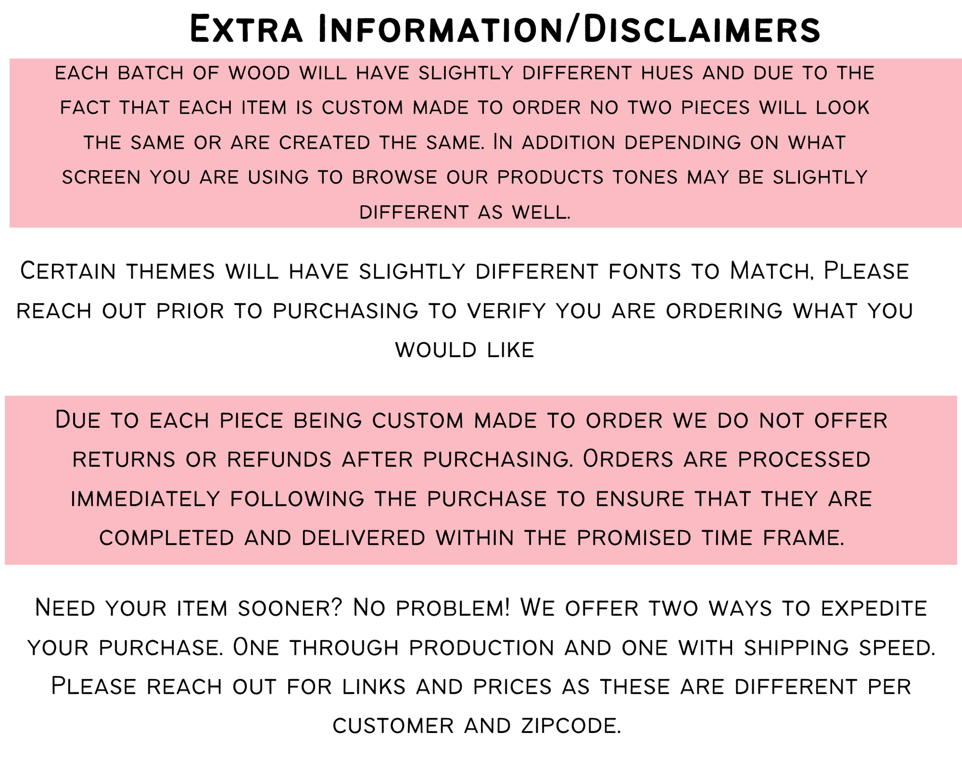 We take a lot of pride in our work as we are a small family-owned business. We hand-choose the wood we cut our products from and pre-made products that we customize and personalize for you are chosen with thought and consideration or the best quality for our customers. Please let us know if you have any questions or concerns with our products.