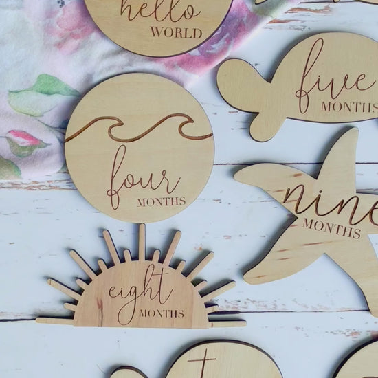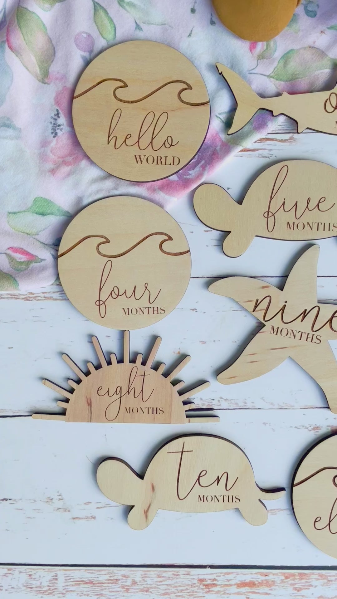 Capture every month of your baby’s first year with this nautical-themed milestone sign set, handmade from beautiful Baltic Birch wood and engraved with charming sea-animal shapes. Perfect for baby announcements, newborn photography, or as a thoughtful baby-shower gift.